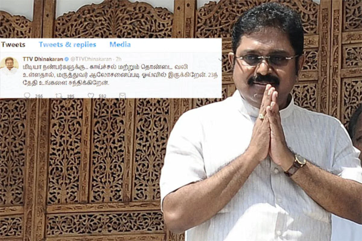 தினகரன் தனது டுவிட்டரில், 'மீடியா நண்பர்களுக்கு... காய்ச்சல் மற்றும் தொண்டை வலி உள்ளதால், மருத்துவர் ஆலோசனைப்படி ஓய்வில் இருக்கிறேன். 23ந் தேதி உங்களை சந்திக்கிறேன்' என்று தெரிவித்துள்ளார். மழை பெய்ததால் காய்ச்சலா? அல்லது ஓபிஎஸ்-ஈபிஎஸ் இணைப்பால் காய்ச்சலா? என்பதே அனைவரின் கேள்வியாக உள்ளது.