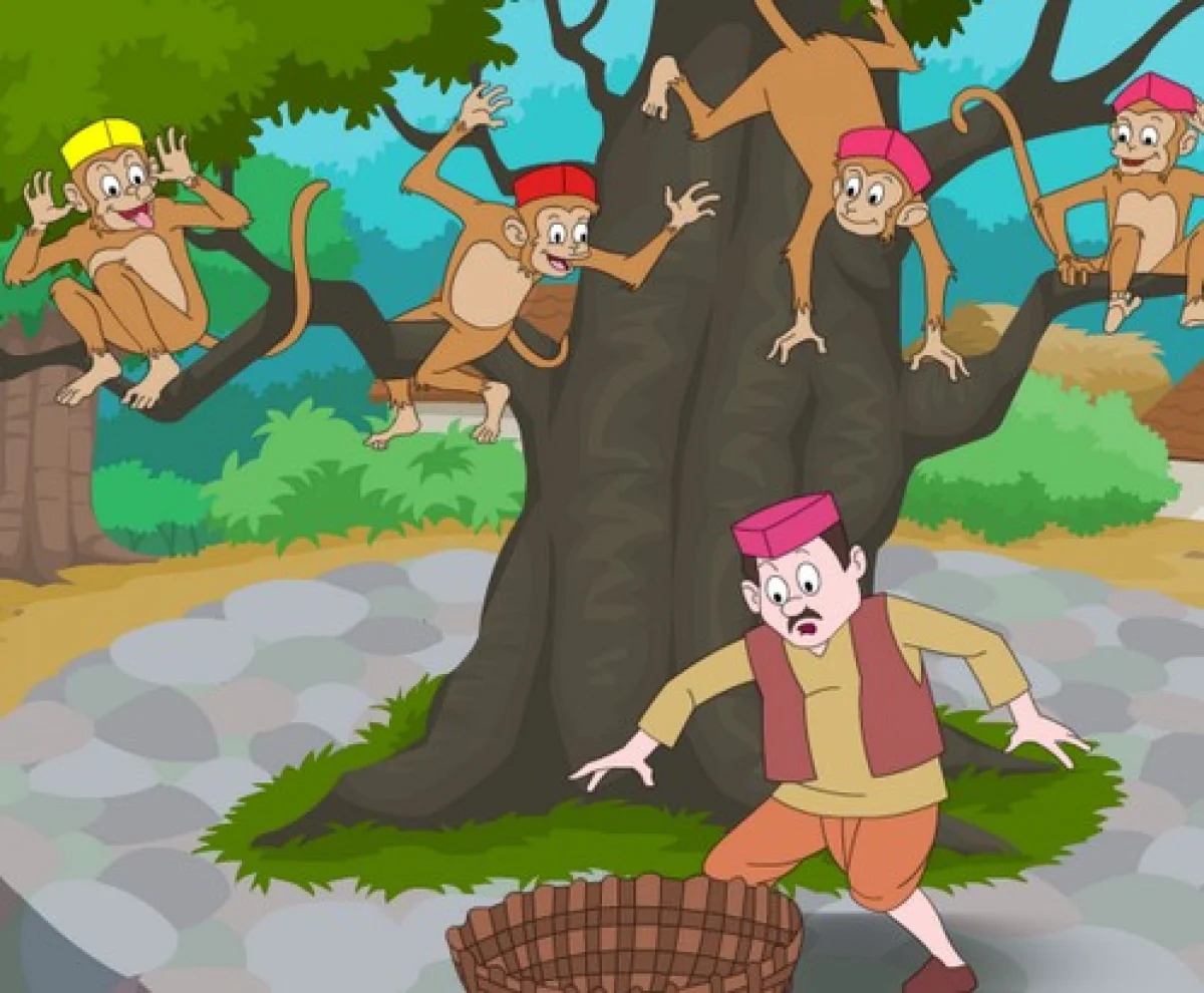 தொப்பிகாரன் விழித்தபோது, அவரது கூடை அனைத்தும் காலியாக இருந்தது. இதனை பார்த்து சுற்றிலும் தேடிப்பார்த்தான், எங்கும் காணவில்லை.பிறகு மரத்தில் உள்ள ஒரு குரங்குகள் கூட்டம் அதனை தங்கள் கை, தலைகளில் போட்டு கொண்டிருந்தன.