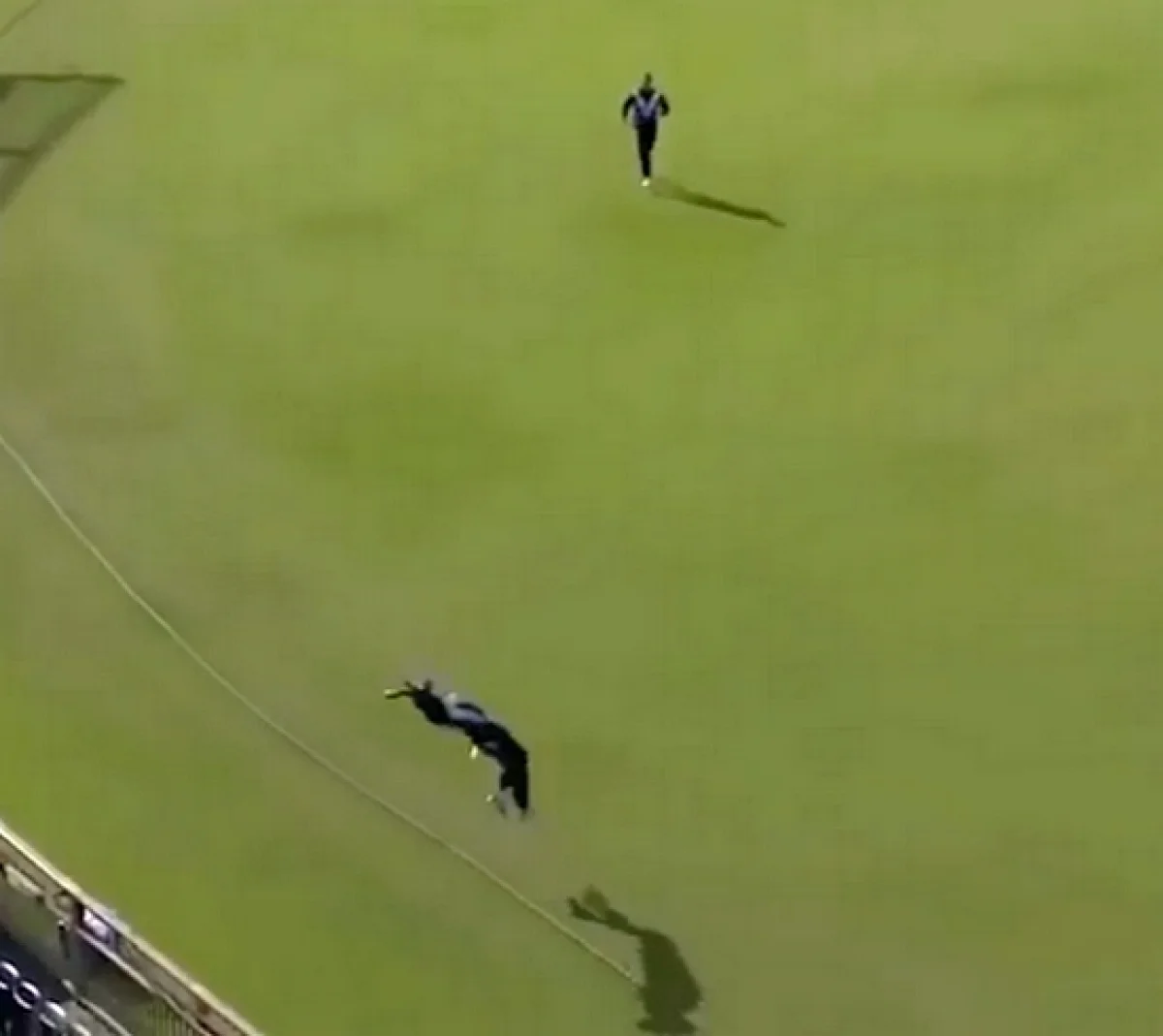 ஆஸ்திரேலியாவின் உள்ளூர் போட்டியான மடாடோர் கோப்பை பெர்த்தில் நடைபெற்றது. இதில், பேட்ஸ்மேன் டி ஆர்ஸி அடித்த பந்து சிக்ஸராக மாறும் என அனைவரும் எதிர்பார்த்திருந்த நிலையில், எல்லைக்கோட்டிற்கு அருகே நின்று கொண்டிருந்த கிளைன் மேக்ஸ்வெல் அபாரமாக பிடித்து அருகில் நின்று கொண்டிருந்த ரோப் குயினியிடம் எறிந்தார்.