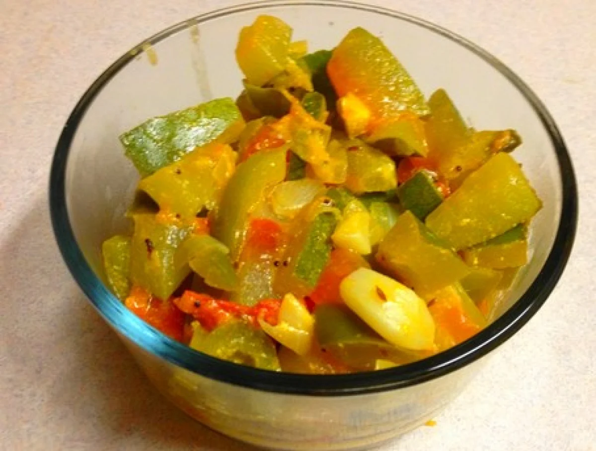 கொள்கலனை அடுப்பில் வைத்துச் சூடேற்றவும். பின்பு சிறிது எண்ணெய் விட்டு, கடுகு, வெந்தயம் போட்டு எண்ணெய் காய்ந்து விட்டதென உறுதிப்படுத்திக் கொள்ளவும். பின்பு, நறுக்கி வைத்திருக்கும் வெங்காயம், இஞ்சி, பூண்டு, குடமிளகாய், தக்காளி, தர்பூசணியோட்டுச் சீவல் ஆகியவற்றை வரிசையாகச் சற்று இடைவெளி விட்டு, கொள்கலனில் இட்டு, இட்டு, வதக்கவும். தற்போது முட்டையை உடைத்து இடவும். பின்பு அந்தக் கிண்ணத்திலிருக்கும் தயிர் ஊற்றிக் கிண்டவும்.