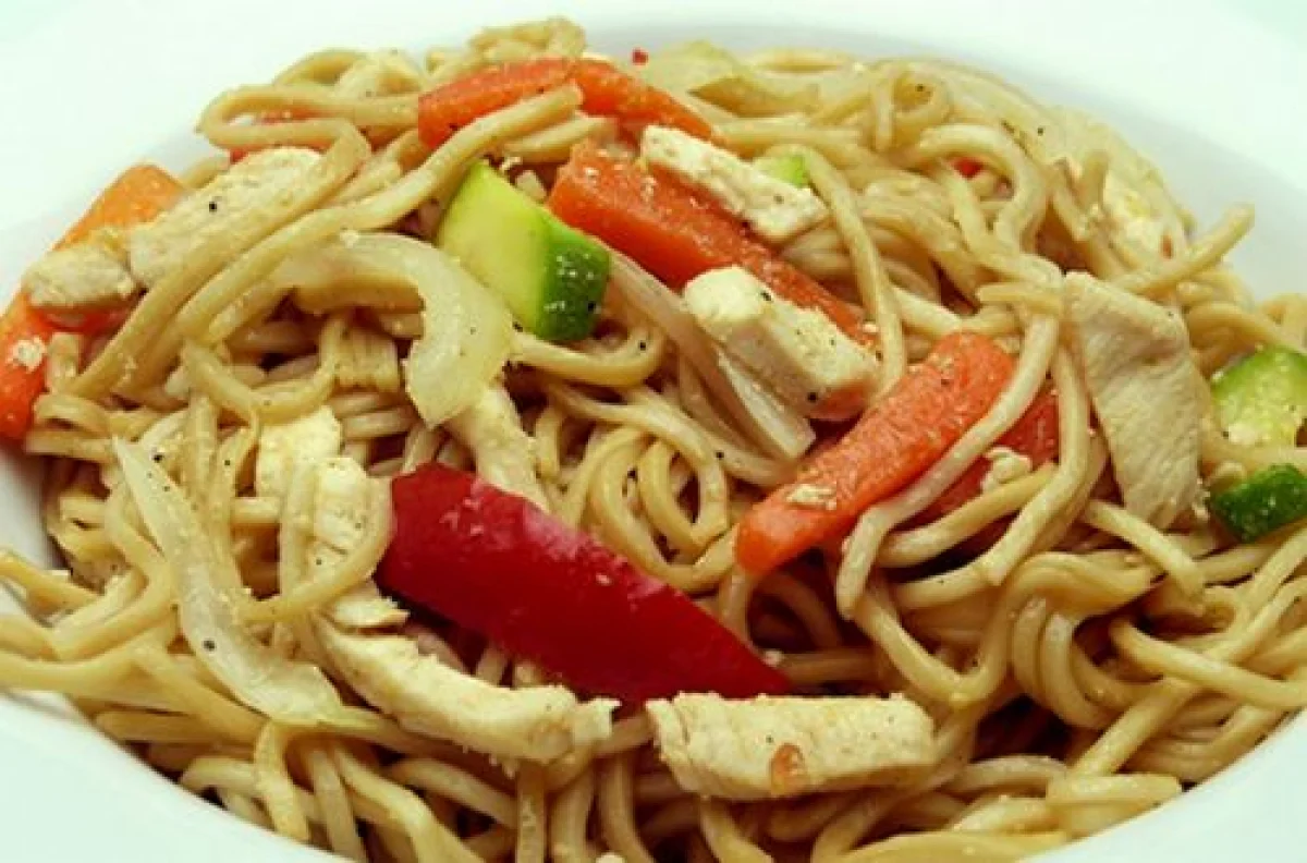 சிக்கனை நன்றாக சுத்தம் செய்து, வேக வைத்து தனியாக எடுத்துக் கொள்ளவும். அகலமான கடாயில் நீர் ஊற்றி நூடுல்ஸை வேக வைத்து தனியாக எடுத்துக் கொள்ளவும்.