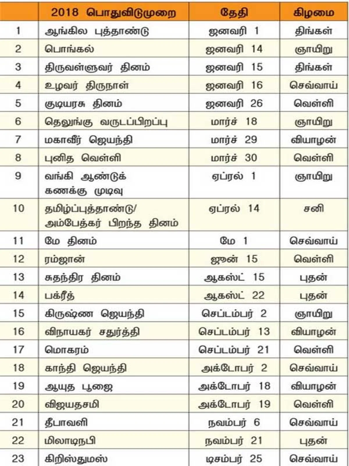 2018ஆம் ஆண்டின் விடுமுறை தினங்களில் 4 நாட்கள் ஞாயிற்றுக்கிழமைகளில் வருகிறது. மேலும் ஆங்கிலப் புத்தாண்டு ஜனவரி 1 திங்கட்கிழமை வருவதால், இந்தாண்டு டிசம்பர் 30, 31 ஆம் தேதியுடன் சேர்த்து 3 நாட்கள் தொடர் விடுமுறை வருகிறது.