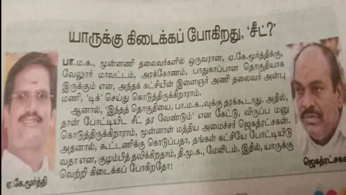 குறிப்பிட்ட செய்தியில் ‘பாமக முன்னணி தலைவர்களில் ஒருவரான ஏ.கே. மூர்த்திக்கு வேலூர் மாவட்டம் அரக்கோணம் தொகுதி பாதுகாப்பானதாக இருக்கும் என அந்தக் கட்சியின் இளைஞர் அணித் தலைவர் அன்புமணி டிக் செய்து கொடுத்துள்ளாராம்.