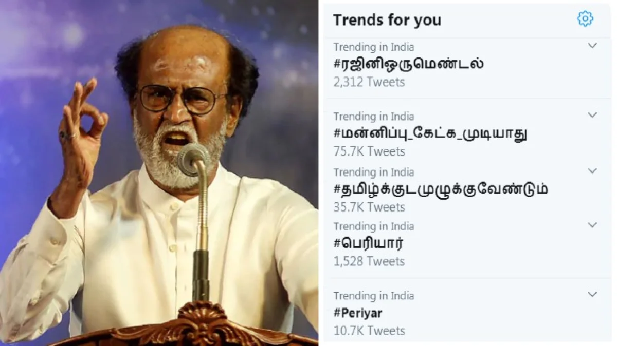 அந்த வகையில் சமூக வலைத்தளமான டிவிட்டரிலும் டிவிட்டர்வாசிகள் ரஜினியை புகழ்ந்தும், திட்டியும் வருகின்றனர். அந்த வகையில், #மன்னிப்பு_கேட்க_முடியாது, #ரஜினிஒருமெண்டல், #பெரியார் போன்ற ஹேஷ்டேக்குகளை டிரெண்டாக்கி வருகின்றனர்.