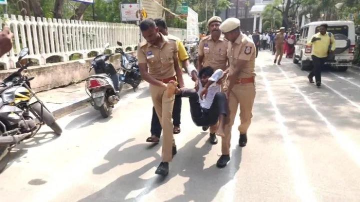 அப்போது இளைஞர் ராகேஷ், மாவட்ட ஆட்சியர் வளாகத்தில் உள்ள வேப்ப மரத்தின் உச்சியில் ஏறி, தன் பாக்கெட்டில் மறைத்து வைத்திருந்த பெட்ரோல் நிரப்பிய கேனை எடுத்து உடல் மீது ஊற்றிக் தற்கொலை முயற்சி மேற்கொண்டார்.