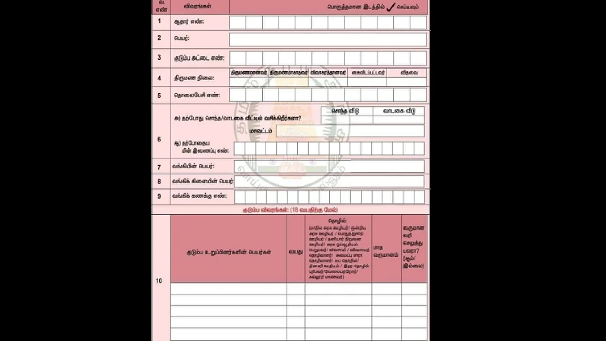 இந்த விண்ணப்ப படிவத்தில் விண்ணப்பதாரரின் ஆதார் எண், பெயர், குடும்ப அட்டை எண், தொலைபேசி எண் உள்ளிட்ட தகவல்கள் கேட்கப்பட்டுள்ளது.