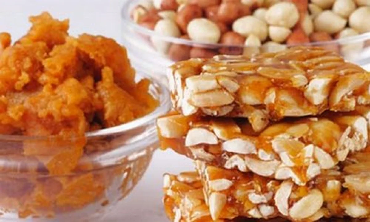 * ஒரு தட்டில் நெய் தடவி வைக்கவும். அந்த சமயத்தில் பாகை இறக்கி, வேர்க்கடலையைச் சேர்த்து நன்கு கிளறி, நெய் தடவிய தட்டில் கொட்டி, சமமாகப் பரப்பவும். ஆறியதும் துண்டுகள் போடுங்கள்.