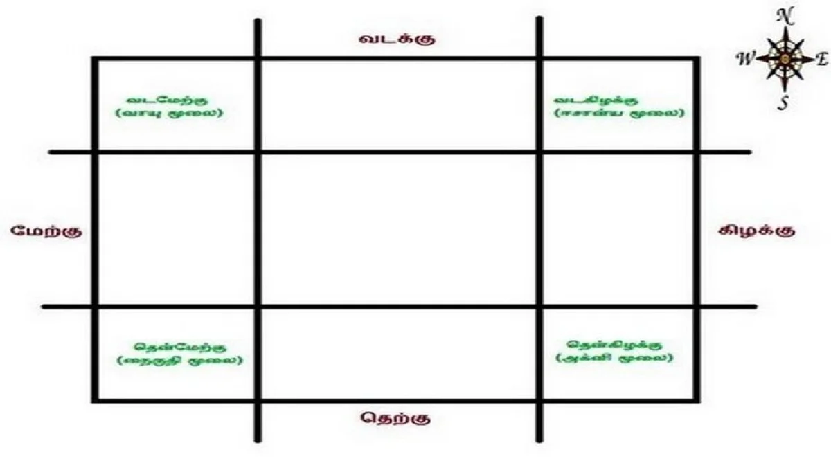 தெற்கும் மேற்கும் சந்திக்கும் இடம் தென்மேற்கு மூலையாகும் (நைருதி மூலை / கன்னி மூலை) மற்றும் வடக்கும் மேற்கும் சந்திக்கும் இடம் வடமேற்கு மூலையாகும் (வாயு மூலை)