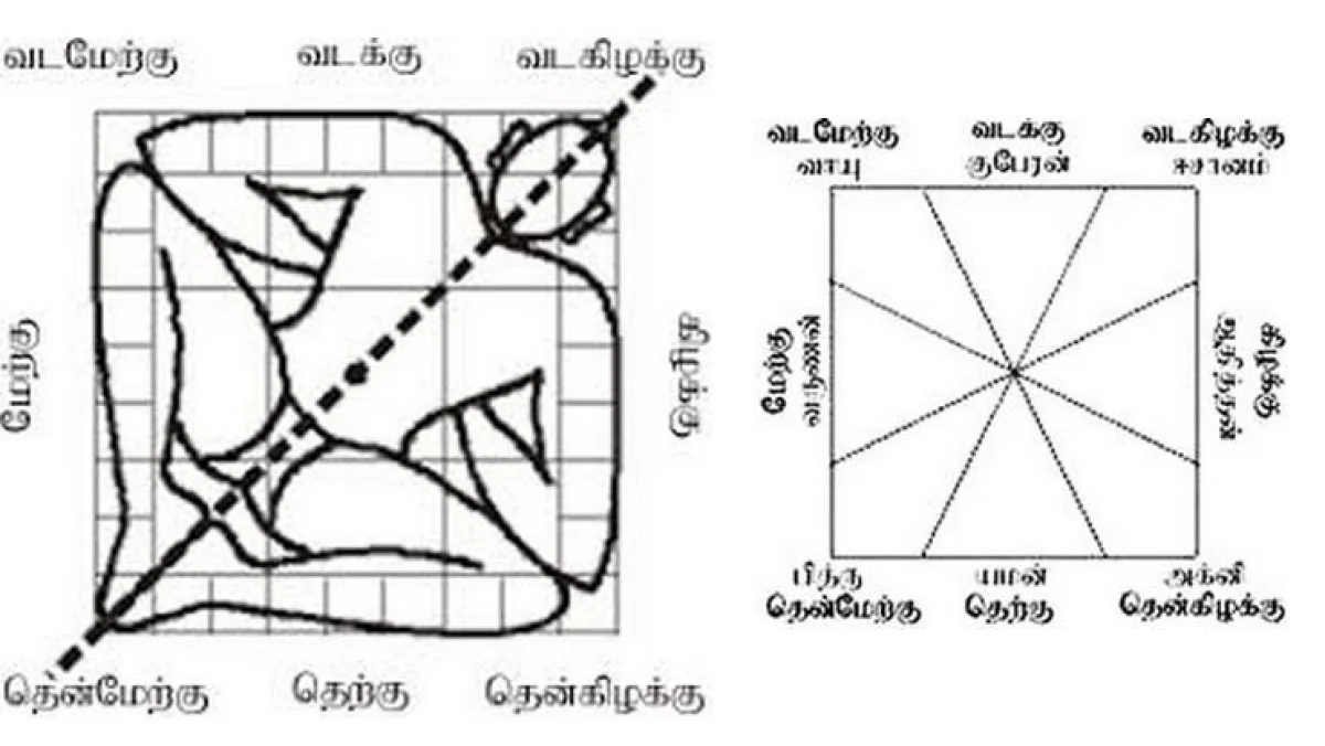 வடமேற்கு, வடகிழக்கு, தென்கிழக்கு, தென்மேற்கு ஆகிய திசைகளுக்கு முறையே வாயு, ஈசன், அக்னி, பித்ரு ஆகியோர் அதிபதிகள். இந்து தத்துவங்களின்படி நிலம் உயிர்ப்புள்ள ஒன்றாகவே கருதப்படுகின்றது. ஒவ்வொரு கட்டிட மனையிலும் உள்ள இந்த உயிர்ப்புச் சக்தியையே வாஸ்து புருஷன் என வாஸ்து சாஸ்திரம் உருவகப்படுத்துகின்றது. இந்த உருவகம் குறியீட்டு வடிவில் தரப்படும் போது, வடகிழக்கில் தலையும், தென்மேற்கில் காலும் இருக்க வாஸ்து புருஷ மண்டலத்தைக் குப்புறப்படுத்தபடி ஆக்கிரமித்திருக்கும் ஒரு ஆண் உருவமாக வாஸ்து புருஷன் உள்ளார்.