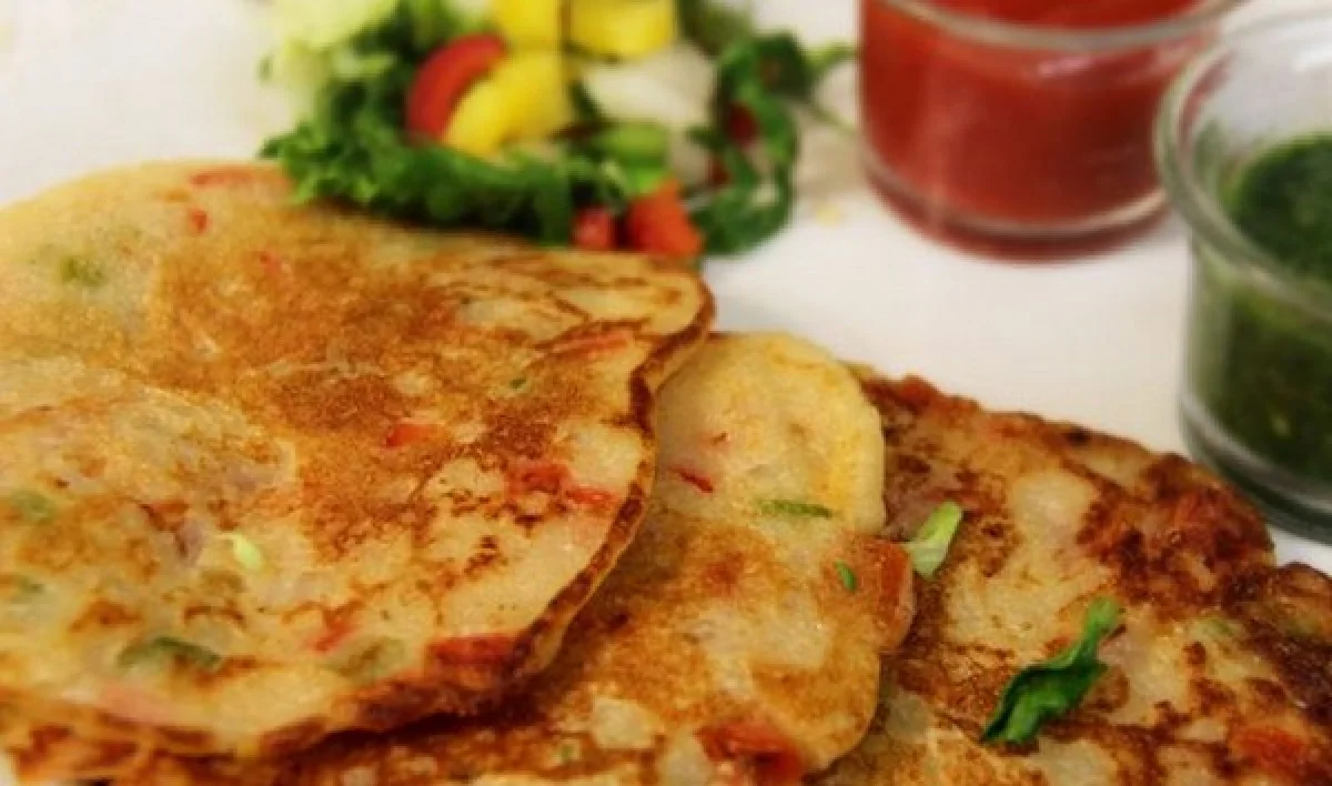 பிறகு நறுக்கிய வெங்காயம், கீரை சேர்த்து வதக்கி, கொஞ்சம் உப்பு போட்டுக் கிளறவும். நன்றாக வதங்கியதும் அடுப்பை அணைத்துவிடவும். ஒரு பாத்திரத்தில் பாசிப்பருப்பு மாவு, கோதுமை மாவு, கடலை மாவை சேர்த்துக்கிளறி இதனுடன் வதக்கி வைத்த வெஜிடபிள் கலவையை சேர்த்துக் கலக்கவும். பிறகு, உப்பு சரிபார்த்து தேவையான தண்ணீர் விட்டு தோசை மாவு பதத்துக்குக் கரைக்கவும். தோசைக்கல்லை சூடாக்கி, மாவை கரண்டியால் எடுத்து சற்றே மெல்லிய ஊத்தப்பங்களாக ஊற்றி, சுற்றிலும் சிறிதளவு எண்ணெய் விட்டு, இரண்டு பக்கமும் வேகவிட்டு எடுக்கவும்.