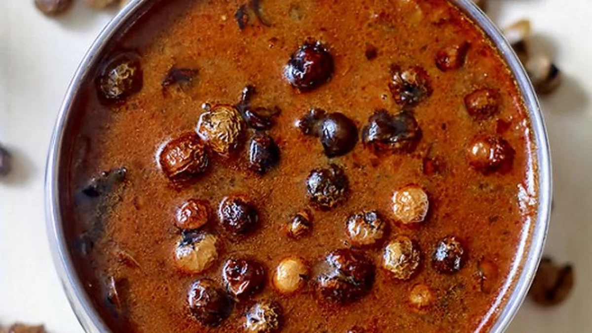 அதே எண்ணெய்யில் கடுகு, உளுந்து தாளிக்கவும். பூண்டு, சின்ன வெங்காயம் சேர்த்து நன்கு வதக்கவும். பிறகு அதனுடன் புளி, உப்பு சேர்த்து கரைத்து வடிகட்டி வதங்கிய பூண்டு,வெங்காயத்துடன் சேர்த்து விடவும். மஞ்சள் பொடி சேர்க்கவும். இதனுடன் அரைத்த விழுது சேர்க்கவும். கொதிக்கும் போது வறுத்து வைத்த வத்தல் வகைகளை சேர்க்கவும். கொதிக்கும் பொழுது 2 டேபிள் ஸ்பூன் நல்ல எண்ணெய் விடவும். நன்கு வற்றிய பிறகு இறக்கவும்.