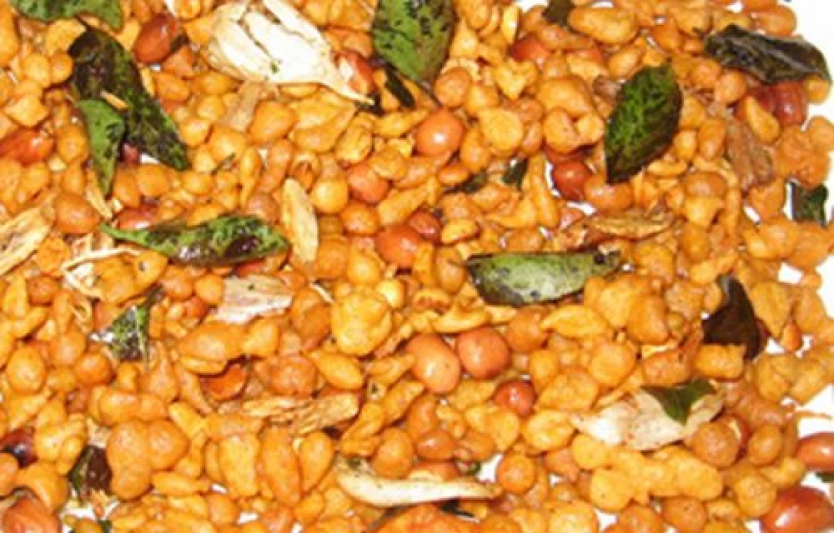 பூந்தி நன்கு சிவந்ததும் எடுத்து விடவும். மீதமுள்ள எல்லா மாவையும் இதே முறையில் போட்டு வெந்தவுடன் எடுத்து டிஸ்யு பேப்பரில் பரப்பி ஆற விடவும். சூடாக இருக்கும் எண்ணெயில் கறிவேப்பிலையை வறுத்து காரப்பூந்தியுடன் சேர்க்கவும். பிறகு வறுத்து வைத்துள்ள நிலக்கடலையும் சேர்த்து கலந்து விடவும்.