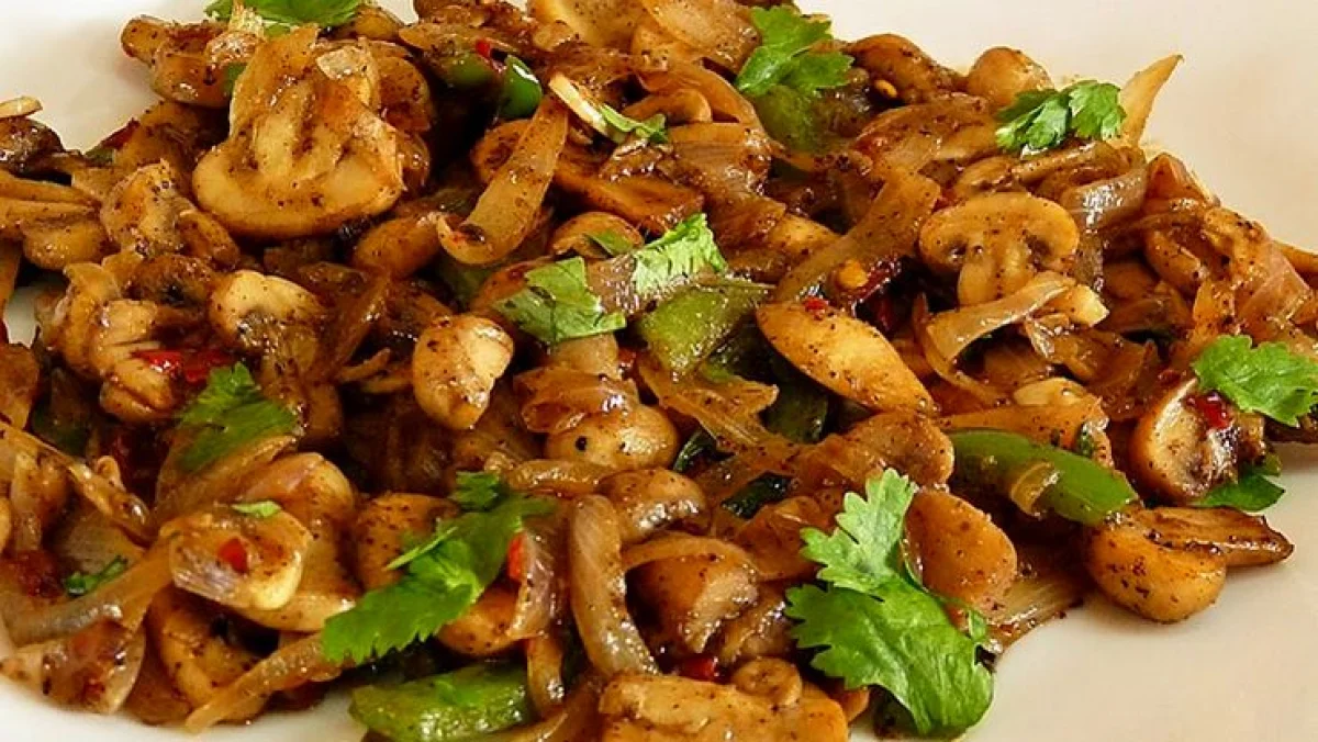 உப்பு, மிளகாய் தூள், மிளகுத் தூள், மஞ்சள் தூள், கரம் மசாலா தூள் சேர்க்கவும். சில சமயங்களில் கால் கப் குடைமிளகாய் சேர்க்கலாம். மேலும் 5 நிமிடங்கள் நன்கு வதக்கி அடுப்பை அணைத்து கொத்தமல்லி தூவி பரிமாறலாம். சுவையான காளான் வறுவல் தயார்.