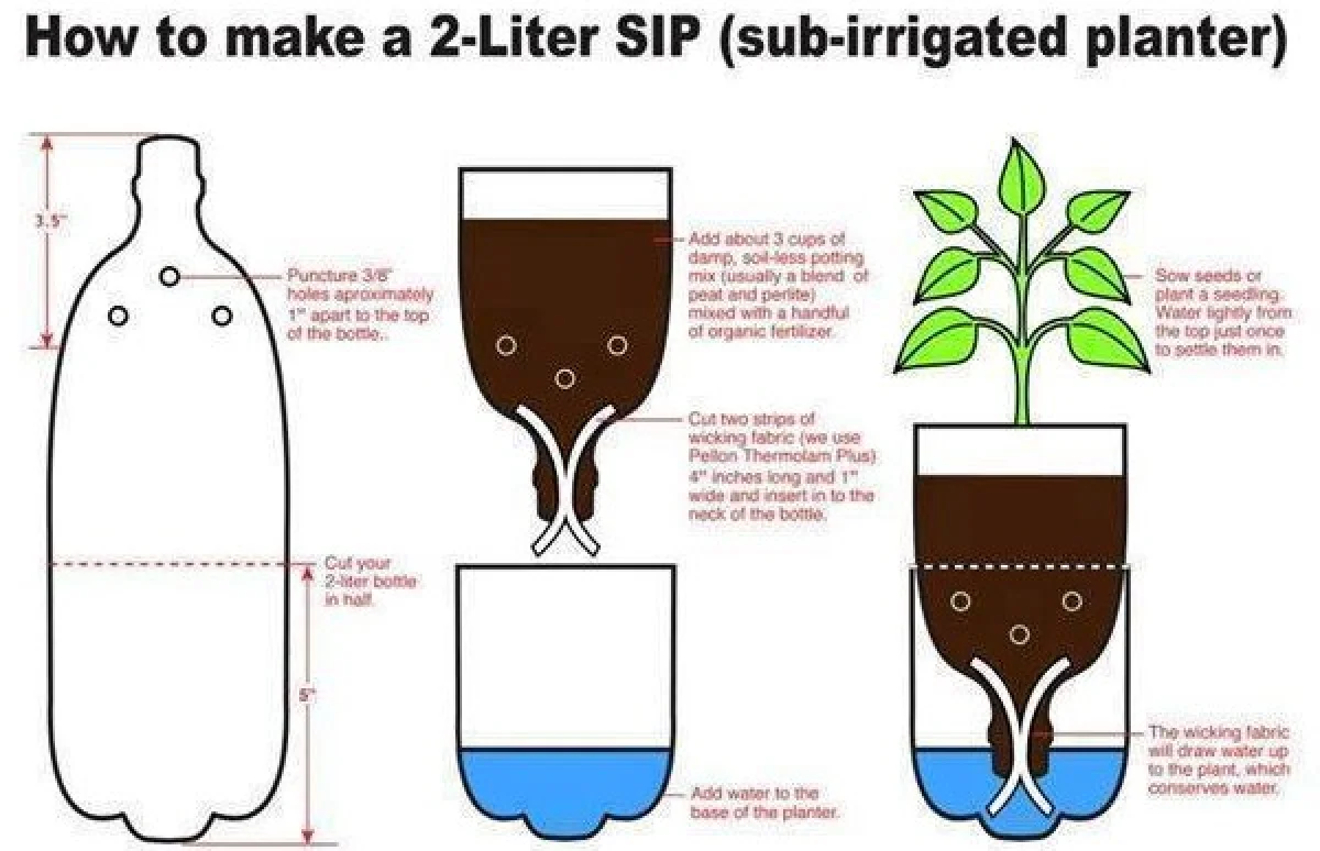 படத்தில் காட்டியுள்ளபடி பாட்டிலின் கழுத்தருகே மூன்று துளைகள் இட்டு பாட்டிலை சரி பாதியாக கட் செய்துக் கொள்ளுங்கள். மேல் பாகத்தில் இயற்கை உரம், மண் கலந்த கலவையை போட்டு, வாய் பக்கத்தில் இரண்டு துணி/பஞ்சு திரி துண்டுகளை வைத்துவிடுங்கள். செடியை நட்டப் பின் தண்ணீர் நிரப்பப்பட்ட பாட்டிலின் கீழ் பாகத்தில் வையுங்கள். அவ்வளவுதான்.