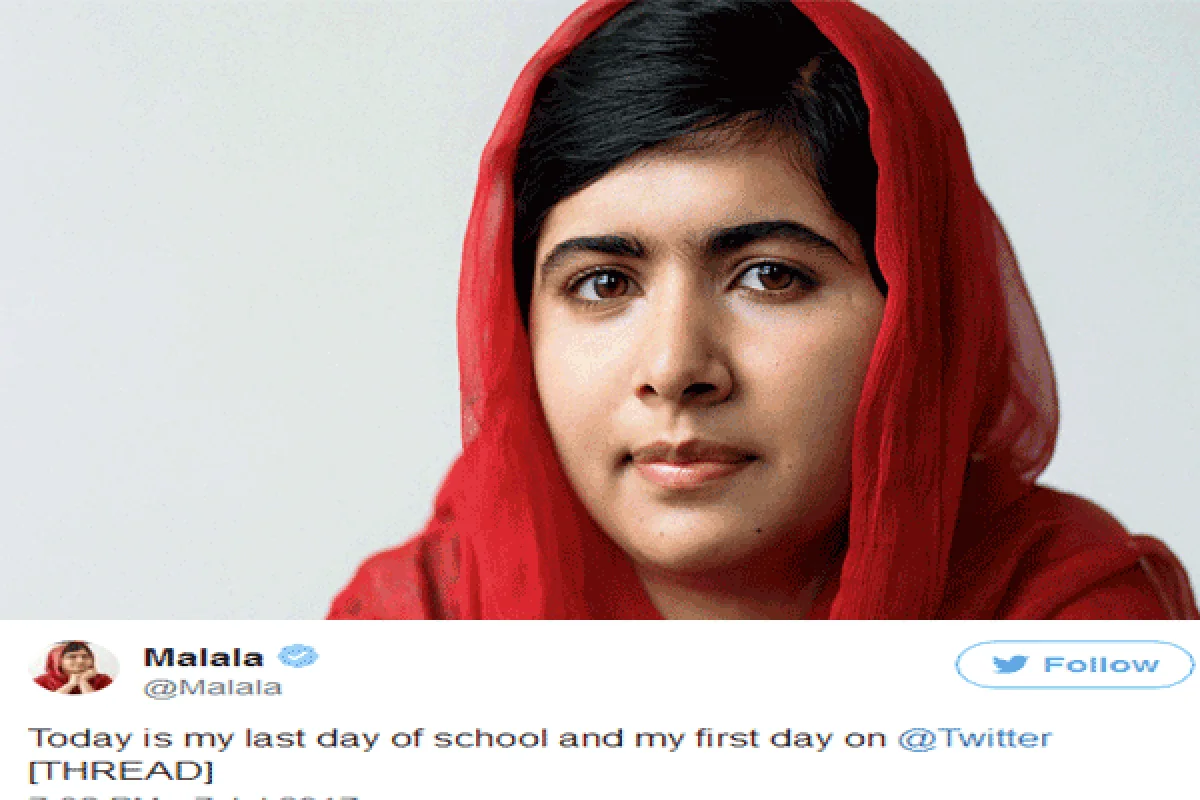 மலாலாவின் முதல் டுவீட் இதுதான்: இன்று தான் எனது பள்ளிப்படிப்பின் கடைசி நாள், ஆனால் டுவிட்டருக்கு முதல் நாள். பள்ளி வாழ்க்கை முடிந்துவிட்டதாக வருத்தமாக இருந்தாலும், எதிர்காலத்தை நினைத்து மகிழ்ச்சி அடைகிறேன். பல லட்சக்கணக்காக பெண்கள், பள்ளிப் படிப்பைக்கூட முடிக்க முடியாத சூழலில் கஷ்டப்படுகின்றனர். அடுத்த வாரம் முதல், மத்திய கிழக்கு ஆப்ரிக்கா மற்றும் லத்தின் அமெரிக்கா சென்று, அங்குள்ள பெண்களைச் சந்திக்க உள்ளேன்' என்று கூறியுள்ளார்.