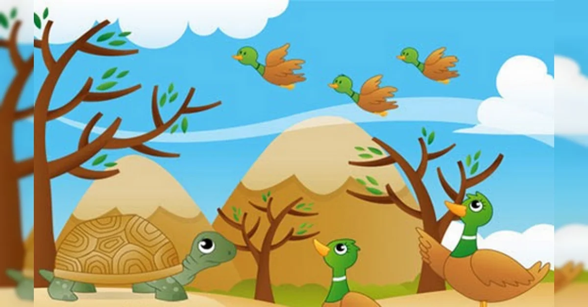 அழகிய ஏரியில் ஆமை ஒன்று தனது இரு வாத்து நண்பர்களுடன் வாழ்ந்து வந்தது. அந்த இரு வாத்துகளை ஆமை சந்திப்பது வழக்கம்.