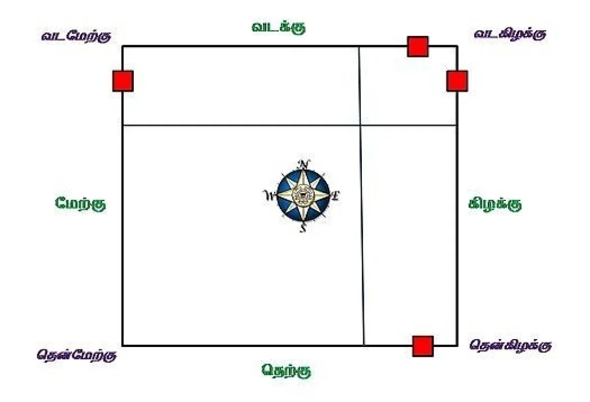 தென்மேற்கு மூலையே ஒரு இடத்தின் ஆற்றல் களமாக கருதப்படுகிறது. எந்த ஒரு சூழ்நிலையிலும் ஒரு கட்டடத்தின் தென்மேற்கு பகுதியில் வாசலோ அல்லது எந்த ஒரு திறப்போ அமைக்ககூடாது.